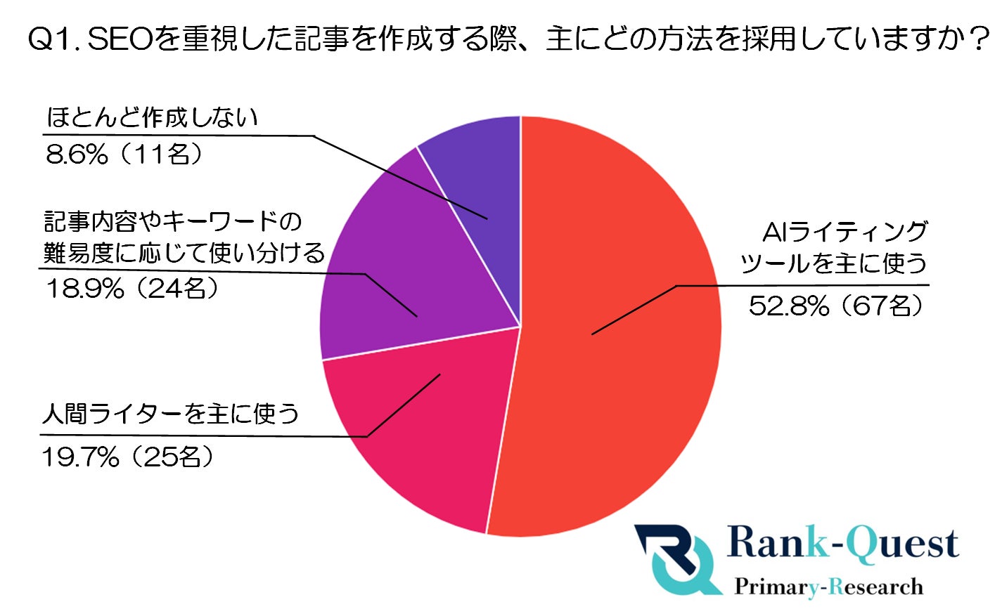 「SEO対策」の検索キーワードでGoogle順位No.1(注)を獲得したランクエスト(https://rank-quest.jp/column/column/how-to-seo/ )は、現役のSEO担当者127名を対象に「AIと人間ライターの使い分け」に関する独自アンケート調査を2025年5月21日~5月22日の期間で実施しました。