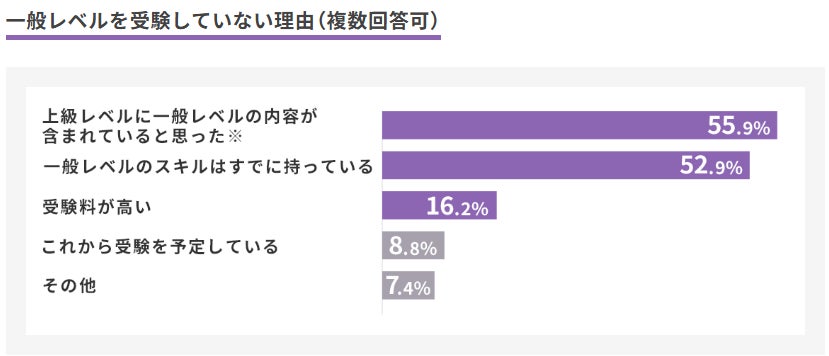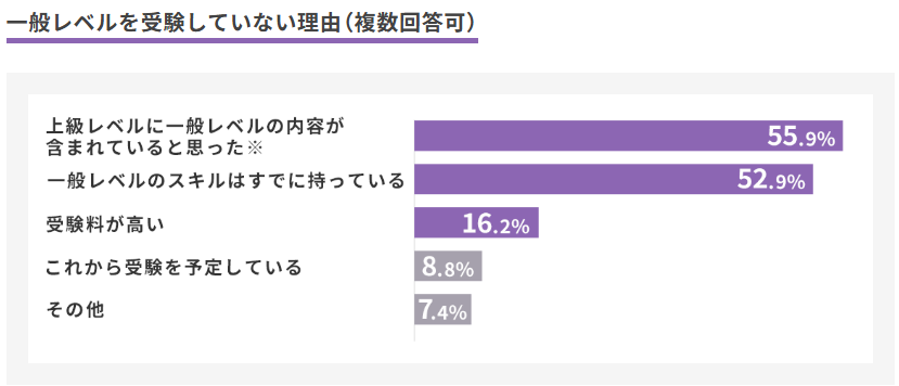 一般レベル・上級レベルの両方を受験した方のうち98%が「両方受験して良かった」と回答。一方で、一般レベルを受験していない方からは、理由として「上級レベルの出題範囲に一般レベルの内容が含まれていると思った」 「一般レベルのスキルはすでに持っている」といった回答が多い結果となりました。