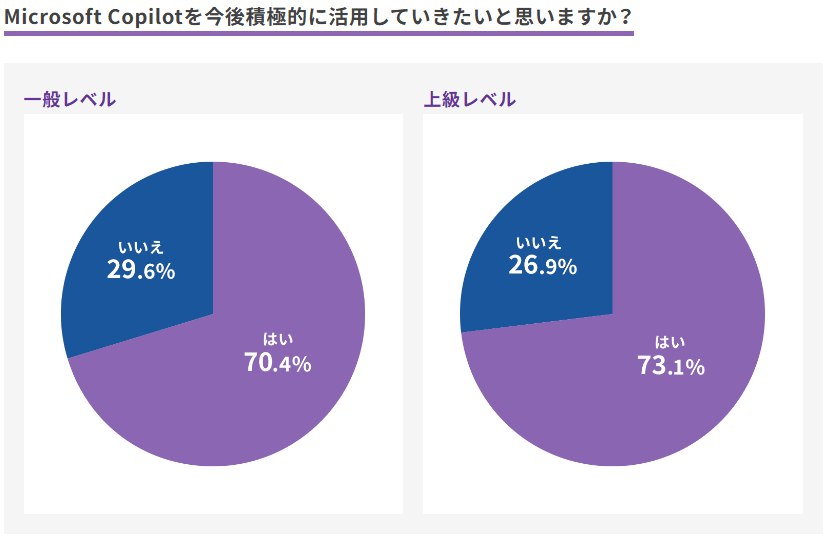 一般レベル合格者・上級レベル合格者ともに、約70%が「Microsoft Copilotを積極的に活用していきたい」、約60%が「MOSにCopilotの科目が加われば受験してみたい」と回答。AI活用への高い関心が見られました。