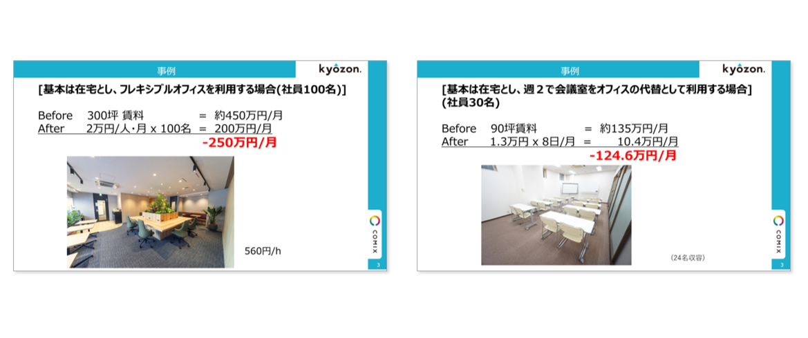 通常ですと、1名あたりのオフィス関連費用は8~9万円/月と言われますが、ハイブリッドワークになる今、コアオフィスを縮小し基本は在宅としながらも、週に1〜2回はチーム形成のために集まるような働き方が増えております。そのような使い方の際には、コアオフィスを残すのではなく、フレキシブルオフィスを活用したり、会議室を代替として利用することで、下記のような形で大幅なコスト削減が可能になります。