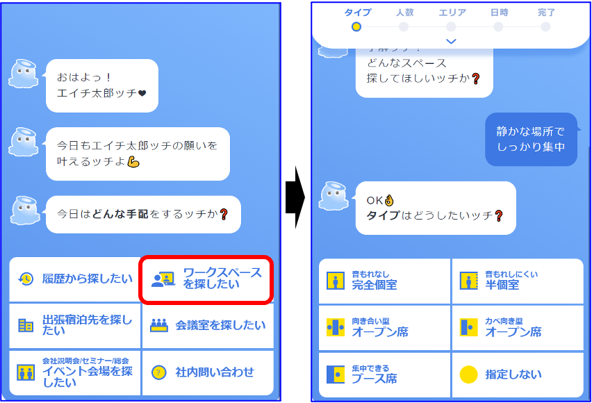 全国12,000施設以上のネットワークをもち、チャットに話しかけるだけで自分の現状に合わせたぴったりなワークスペースを提案してくれ、予約できてしまうサービスです。利用者数は累計8,000社以上となり、多くの法人様がコロナ禍で働き方の変化と共にオフィスの縮小や移転を検討する中で、オフィスコストの削減や変動費化、働き方の多様性の確保などを目的にサービス導入していただいております。従業員の利用金額の制限機能や精算をまとめる機能なども含め、無料で提供しております。