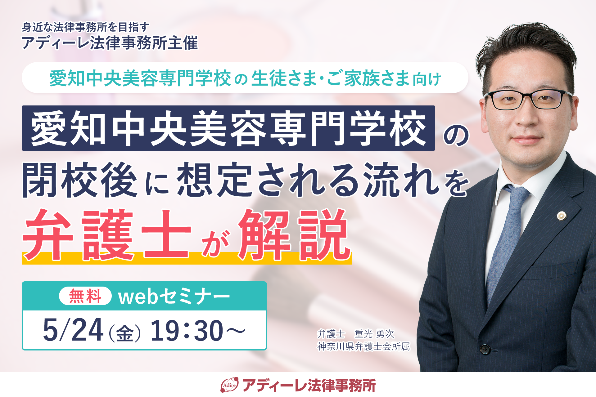 【5/24(金) 無料webセミナー開催】愛知中央美容専門学校の閉校についてアディーレ法律事務所が今後の想定される流れや疑問を法律に基づき解説します