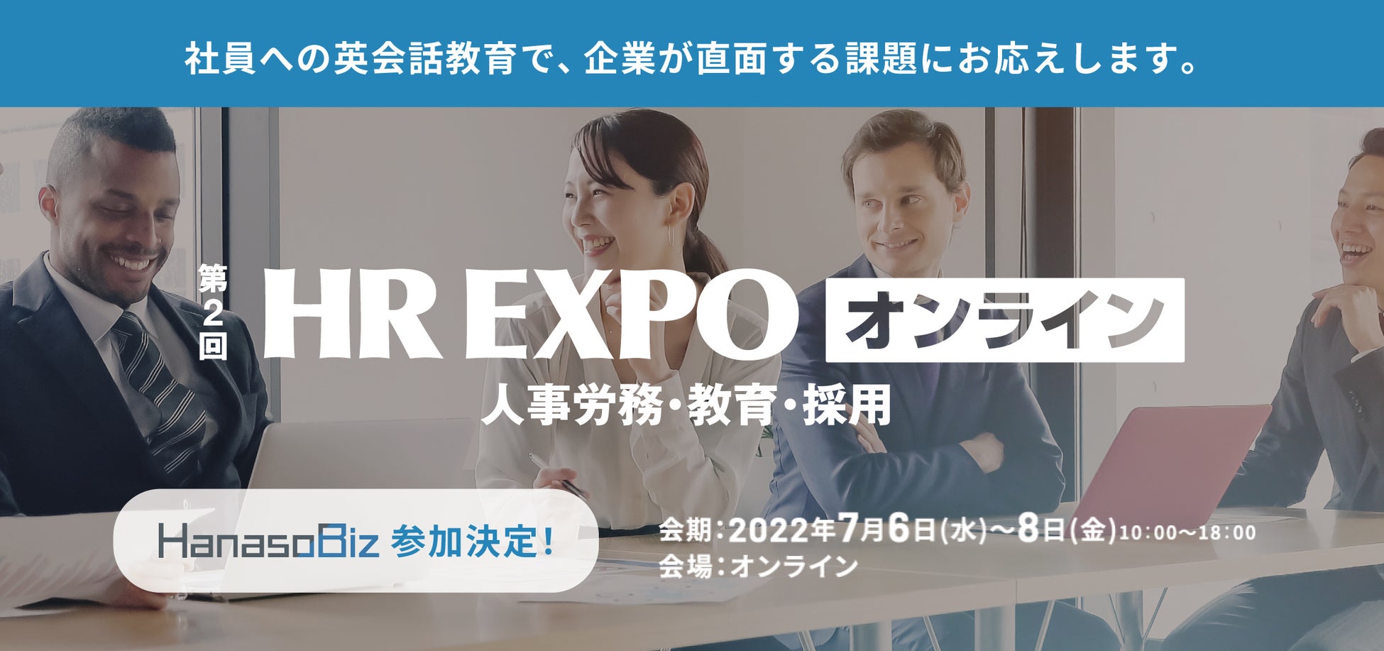 株式会社アンフープ(所在地:静岡県富士市、代表取締役社長:重森 渉)がサイト運営する、ビジネスに特化したオンライン英会話「HanasoBiz」は、2022年7月6日(水)から8日(金)までオンラインで開催される総務・人事・経理Week[オンライン〕「第2回 HR EXPO(人事労務・教育・採用)」に出展いたします。
