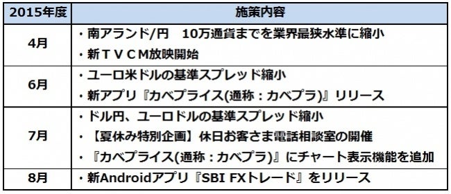 今年に入りましてからも、お客様のご意見やご要望を受けて、3月に南アフリカランド/円のスプレッド縮小、6月・7月には主要通貨であるユーロ/ドル、ドル/円のスプレッド縮小を実施するなど、業界最狭水準のスプレッドをご提供しております。また取引ツールにおいては、ユーザビリティを極限まで追求した新Androidアプリ「SBI FXトレード」を8月にリリースし、更なるサービス向上を図っているところでありますので、是非これからの当社のサービス向上策にもご期待ください。