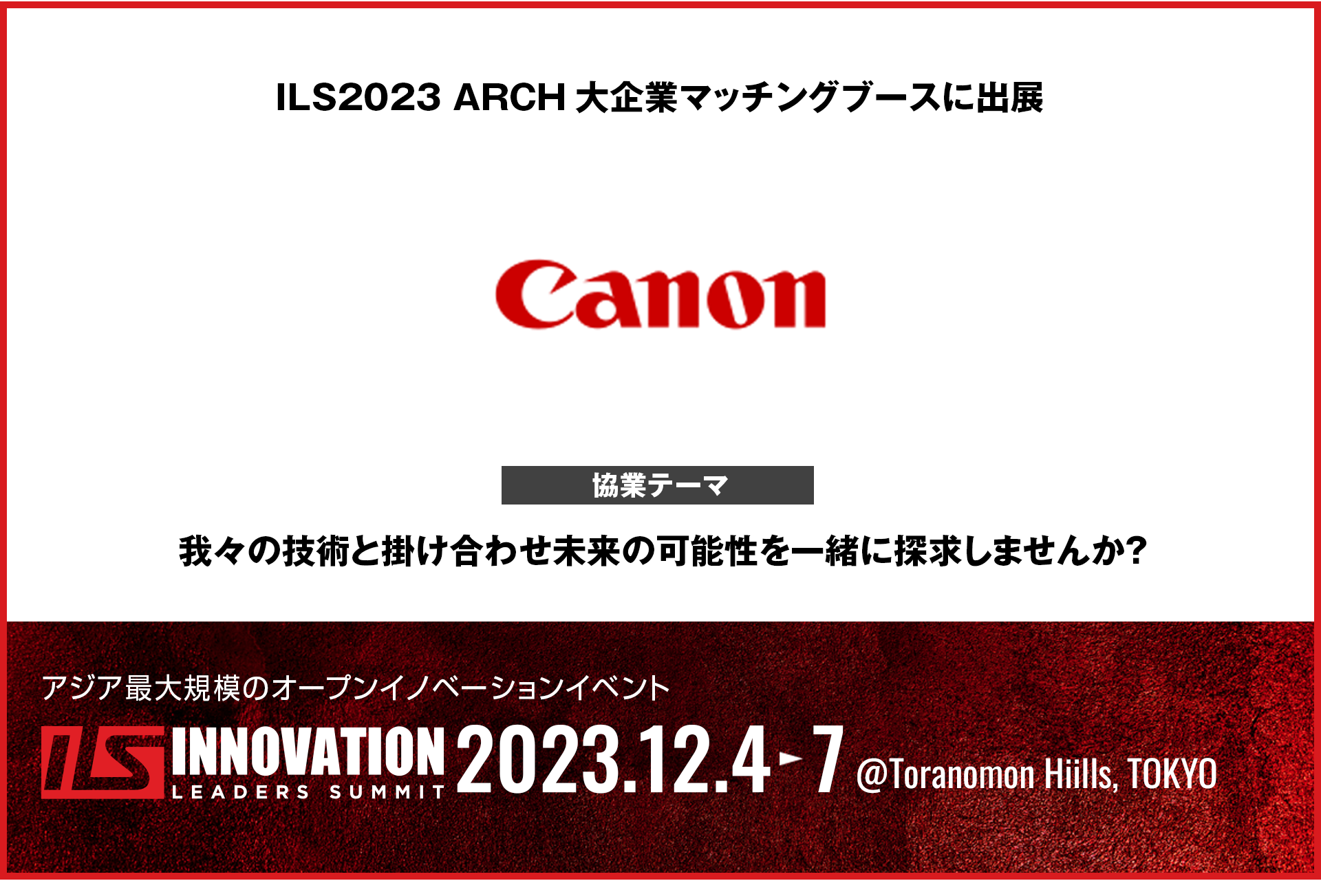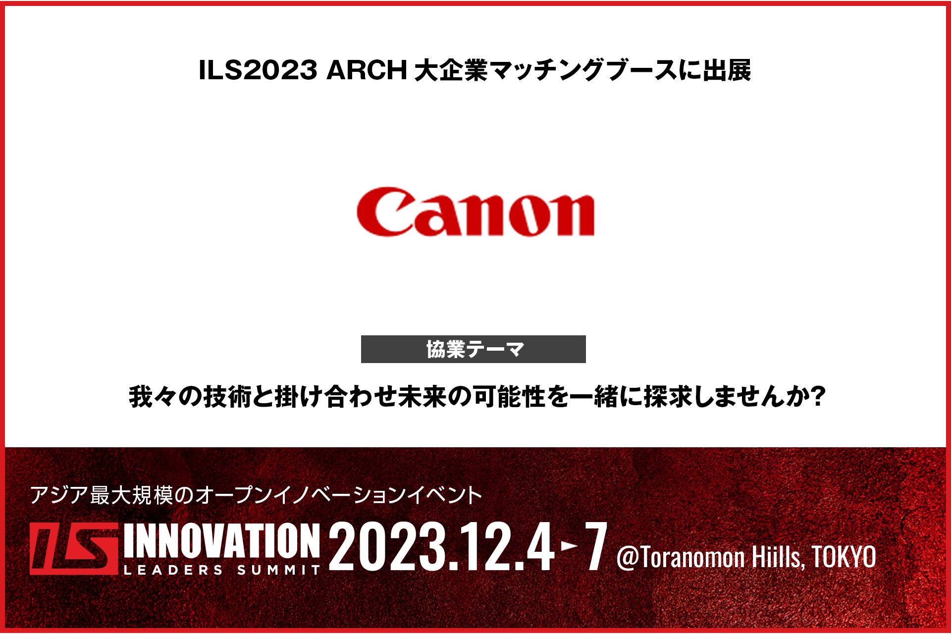 2023年12月4日(月)-7日(木)に虎ノ門ヒルズで開催されるアジア最大級のオープンイノベーションイベント「ILS2023」に、キヤノンが協業マッチングブースを出展します。