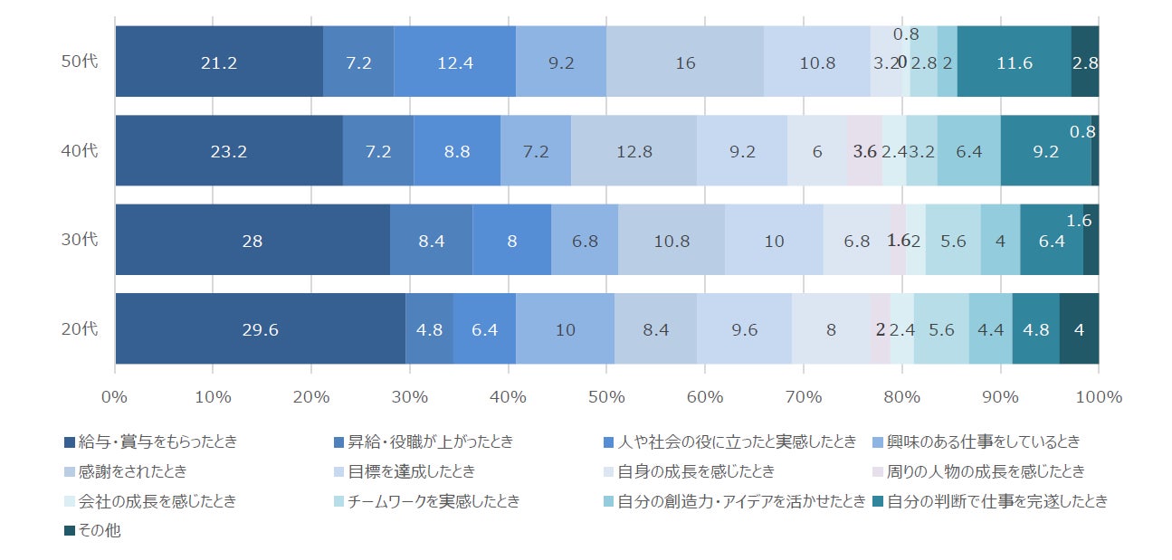 年代別に見ると、全世代共通で最も多かったのは「給与・賞与をもらったとき」でした。次に多かったのは、20代が「興味のある仕事をしているとき」(10.0%)、50代は「感謝をされたとき」(16.0%)と、年代によって仕事のやりがいが異なることが明らかになりました。今年は全世代の1位が共通でしたが、昨年は50代で最も多かったのは「感謝をされたとき」でした。日本での物価高や生活への不安が今回の調査結果に表れていることがわかります。