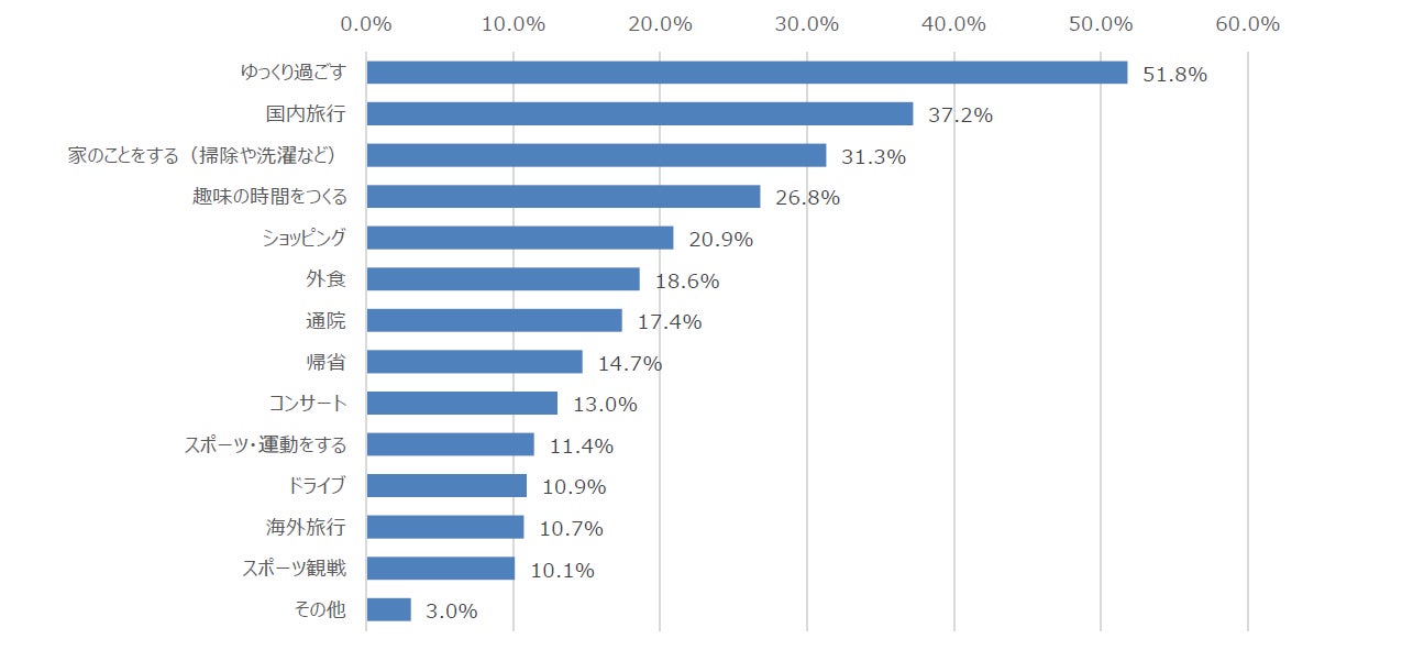 有給休暇で行ったことを聞いたところ、トップ3は「ゆっくり過ごす」(51.8%)、「国内旅行」(37.2%)、「家のことをする(掃除や洗濯など)」(31.3%)でした。