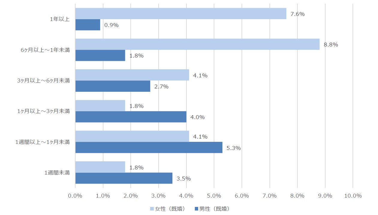 取得期間の内訳をみると、男性は短期(1か月未満)中心で、女性は中〜長期(6か月以上)取得者が多い結果となりました。