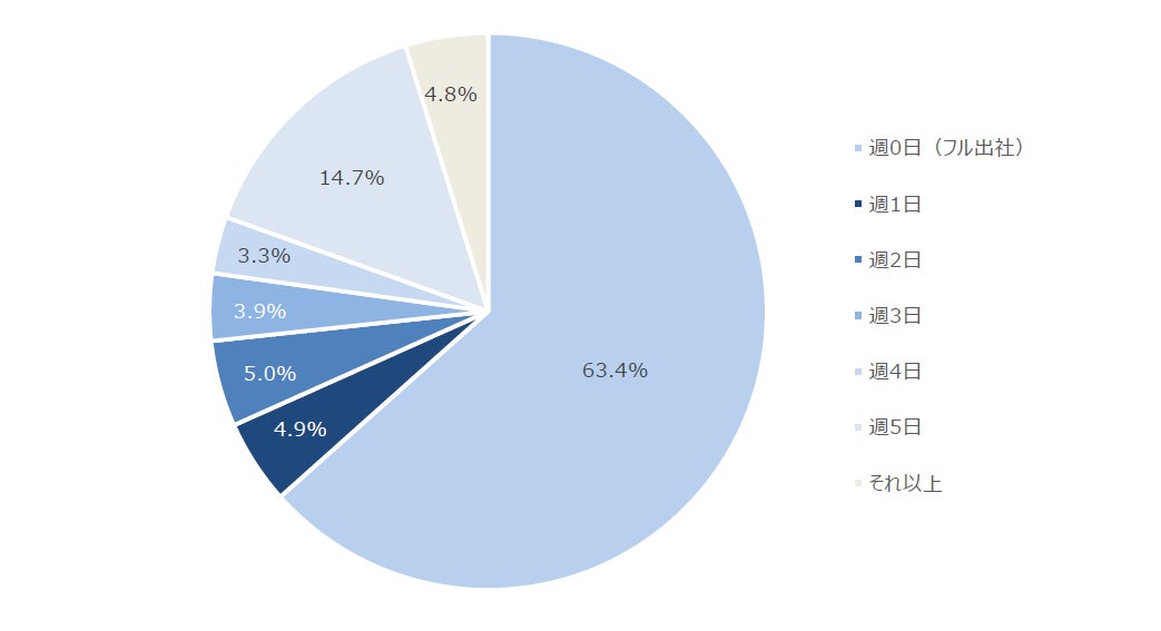 一週間の平均在宅勤務日数を聞いたところ、「0日(フル出社)」(63.4%)が6割以上を占め、次いで「週5日」(14.7%)でした。