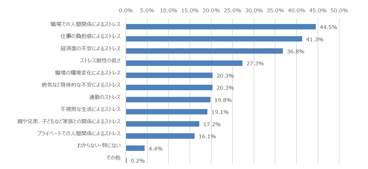 ストレスにより精神面の不調や不安を感じていると回答された方に、なぜ精神面の不調や不安を感じていると思うか聞いたところ、トップ3は「職場での人間関係によるストレス」(44.5%)、「仕事の負担感によるストレス」(41.3%)、「経済面の不安によるストレス」(36.8%)でした。