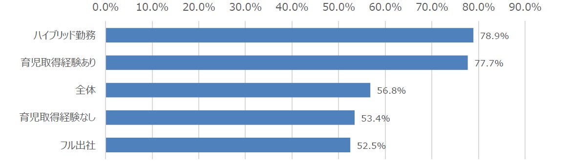 最後に、「ウェルビーイング」という言葉の認知状況についての調査結果です。「ウェルビーイング」とは、身体的・精神的・社会的に良好な状態を意味する言葉で、全体の認知率は56.8%となりました。特に、ハイブリッド勤務層(78.9%)や育休取得経験者(77.7%)では認知率が高く、柔軟な働き方や家庭との両立を経験した人ほど、自身の心身の健康や生活の質を意識する傾向が強いことがうかがえます。経済的不安や仕事上のストレスを抱える人が多い中でも、「自分らしく働く」「心の豊かさを大切にする」といった価値観が広がりつつあり、ビジネスパーソンの“働く幸せ”に対する意識が着実に変化している様子が見て取れます。