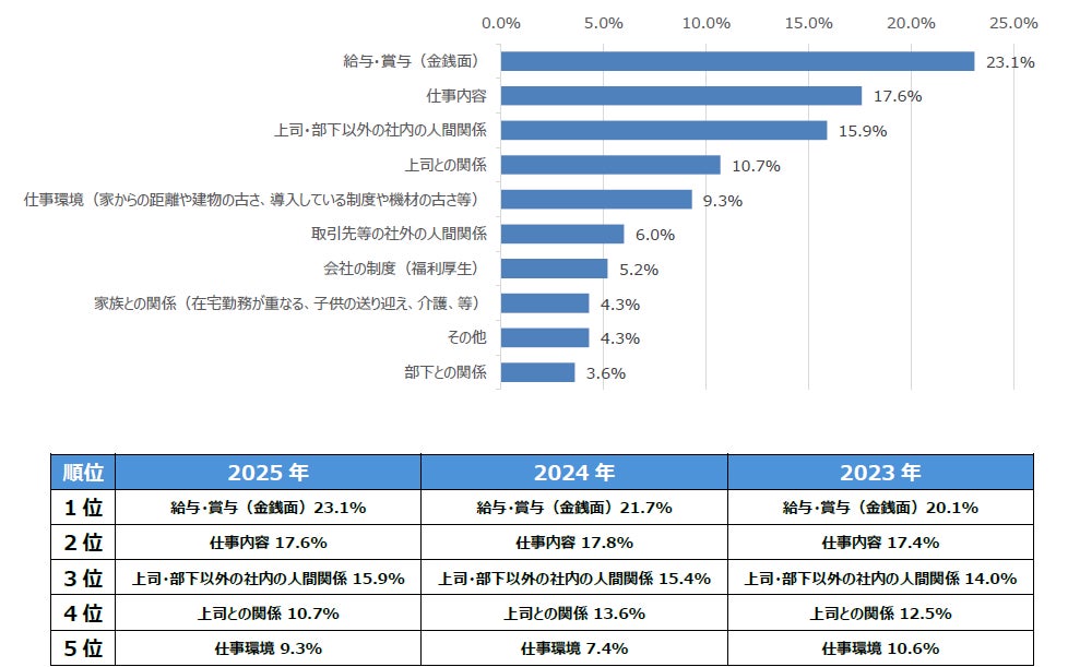 勤務先でのストレスとなる要因は「給与・賞与(金銭面)」が 5回連続1位に
