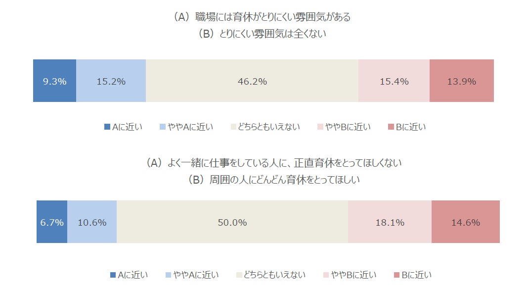 調査の結果、「職場には育休が取りにくい雰囲気がある」と感じている人は24.5%にとどまり、「取りにくい雰囲気は全くない」と答えた人が29.3%と上回りました。また、「よく一緒に仕事をしている人に、正直育休をとってほしくない」と答えた人は17.3%にとどまる一方で、「周囲の人にどんどん育休をとってほしい」と肯定的に捉える人が32.7%でした。これらの結果から、依然として一定数の抵抗感は残るものの、職場や周囲の理解は広がりつつあることがうかがえます。