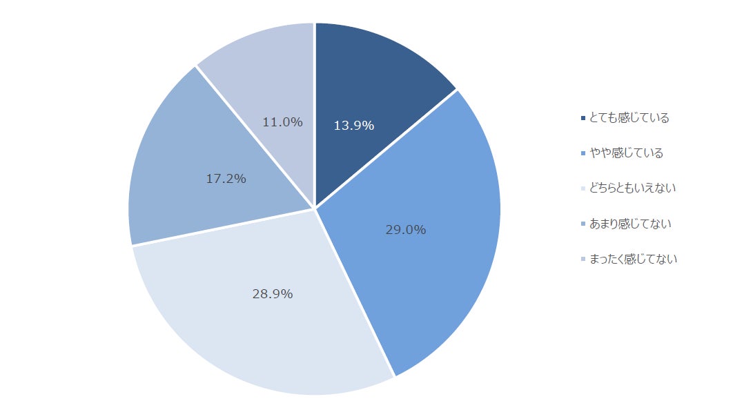 ストレスにより精神面の不調や不安を感じることがあるか聞いたところ、「とても感じている」(13.9%)、「やや感じている」(29.0%)、「どちらともいえない」(28.9%)、「あまり感じていない」(17.2%)、「全く感じていない」(11.0%)でした。