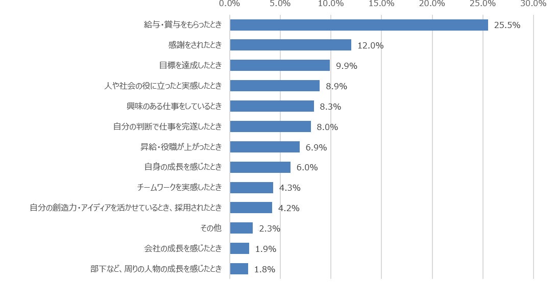 仕事をする上で、最もやりがいを感じる場面について聞いたところ、最も多かったのは「給与・賞与をもらったとき」(25.5%)、次に多かったのは「感謝をされたとき」(12.0%)でした。
