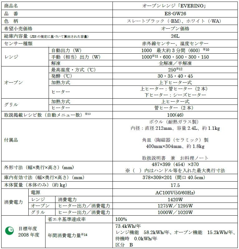 オーブンレンジ「EVERINO」(ES-GW26)ニュースリリース