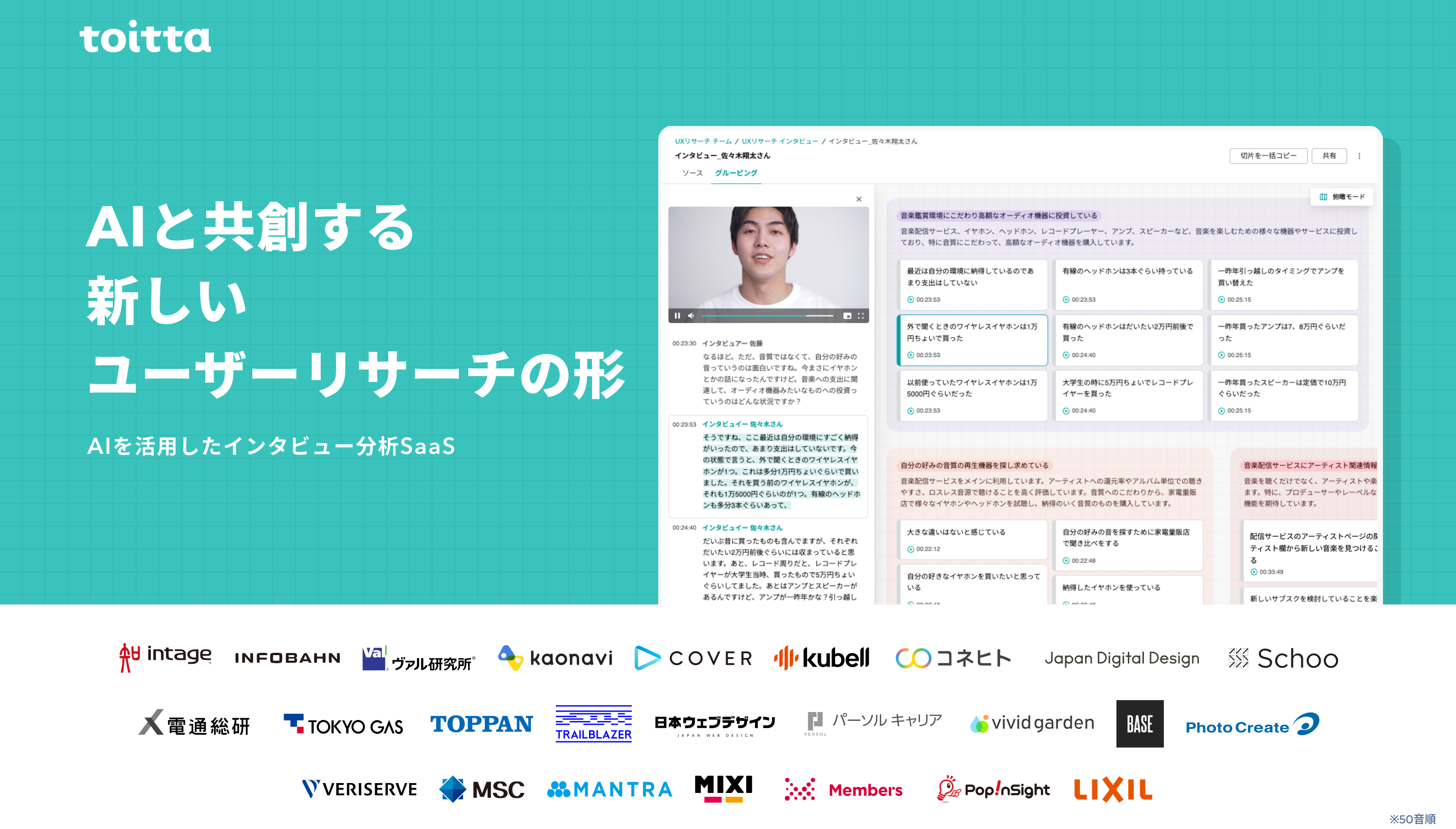 「toitta」では、今後も継続的な機能開発やソリューション提供を通じてインタビューデータの分析・共有・管理に貢献し、サービス開発や改善に関わる担当者・チームの効率化、生産性向上を支援してまいります。