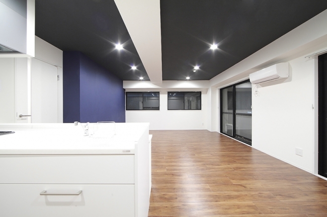 「Renotta」では、一部屋一部屋に独自のコンセプトを設定し、住む人の個性に合うように、「一戸一絵のリノベーション」を行っています。今回、新たに「Renotta」に誕生した「CALM LIFE」は、濃紺の壁と黒い天井で、凛とした大人の居住空間を創り出しています。また、主張しすぎないよう施されたモノクロの柄クロスが、落ち着いた空間の中で、ほどよいスパイスになっています。全体的にシックでセンスのよい色づかいが、冷静さと知性のある大人の雰囲気を演出する、住み心地の良い空間です。