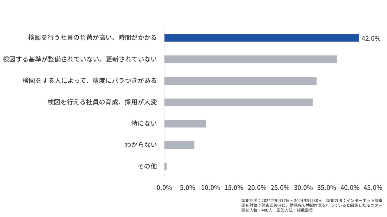 当社が実施した、検図業務に従事する方々を対象とした調査では、42%の方が「検図の負荷が高い・時間がかかる」といった課題を感じていることが明らかになりました。