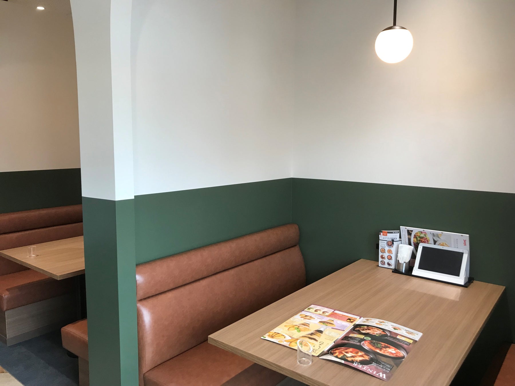 デニーズの伝統の雰囲気である「アメリカンダイナー」に加え、温かい照明と木のぬくもりを加えた「ナチュラル感」を融合し、落ち着きある内外装を実現しています。