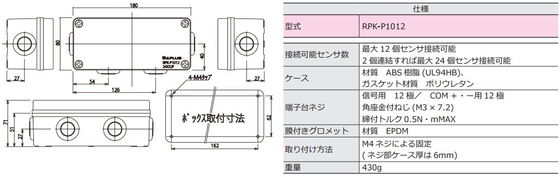 「RPK-P1012」はグロメットタイプの中継ボックスです。最大12個の検出センサを接続可能で、2個連結すれば24点伝送タイプにも対応可能です。また、従来の中継BOXと異なり金属製から樹脂製に変えて軽量化、ローコスト化しました。