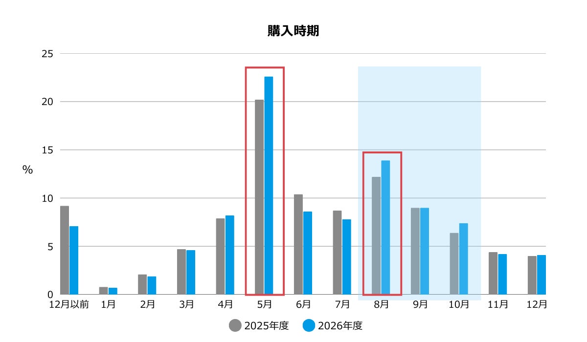 また昨年比でみると、8月から10月にかけての購入が増加しており、購入時期が後半に分散しています。以前は売り切れを心配して早めに購入する方が一定数いましたが、メーカー直営店など購入チャネルの選択肢が増えたことで、お盆以降でも豊富なラインナップから選べることが周知されてきた結果、ご家族のライフスタイルにあわせた時期に購入する方が増加しているようです。