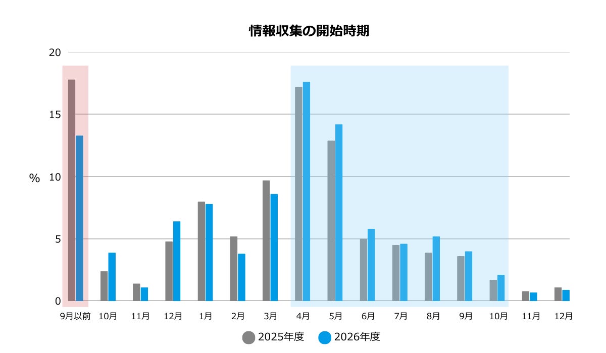 情報収集の開始時期において、昨年比でみると、9月以前(入学の約1年半前)の早い時期から探し始める方は減少しています。対して、4月から10月にかけては割合が増加しており、情報収集の開始時期は分散傾向にあります。