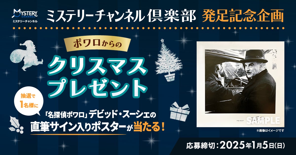 これを記念し、ミステリーチャンネルで放送の「名探偵ポワロ」の主演俳優であるデビッド・スーシェの直筆サイン入りポスターを、メールマガジン会員様を対象に、ご応募いただいた方の中から抽選で1名様にプレゼントいたします。