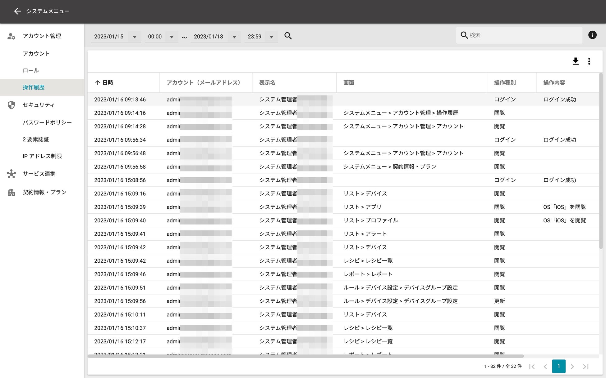 管理コンソール上でのアカウント画面の閲覧や、全ての画面閲覧・設定変更の操作ログを取得。取得したログは1年分保存でき、閲覧だけではなくCSV出力も可能です。