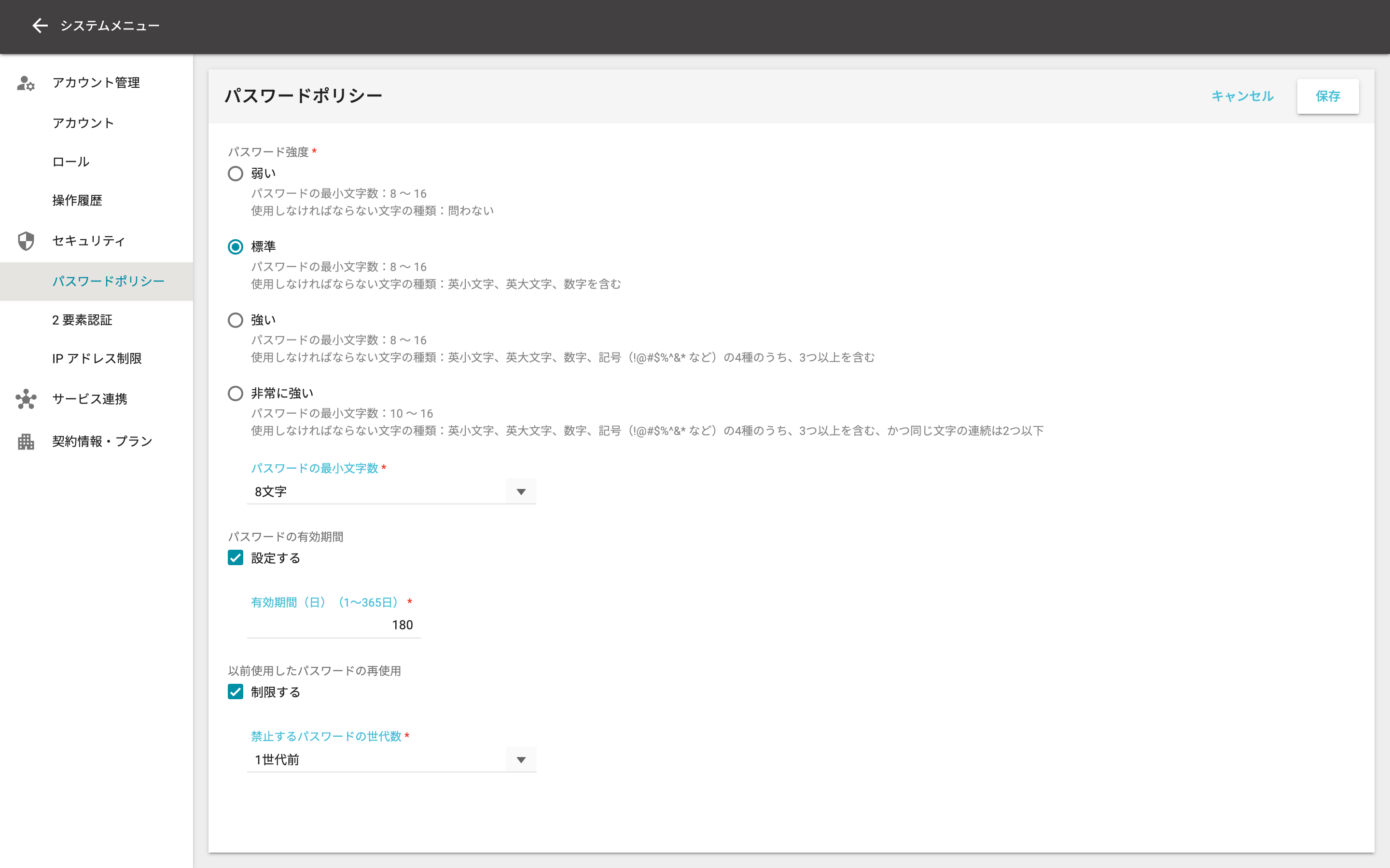 管理コンソールのログインパスワードのセキュリティ強度を設定できます。パスワードの強度(文字数や使用する文字・記号の種類)、有効期間、以前パスワードとして使用した文字列の再使用の制限を設定することで、より強固なセキュリティを可能にします。