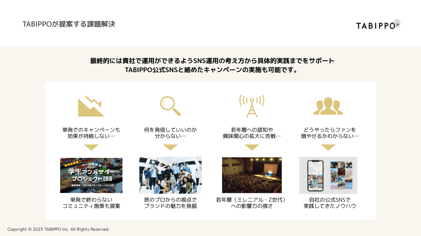 3,000名を超える若者のコミュニティを抱えるTABIPPOが、観光/旅行業界に特化したSNS戦略をもとにSNSアカウントの運用サービスを行います。
