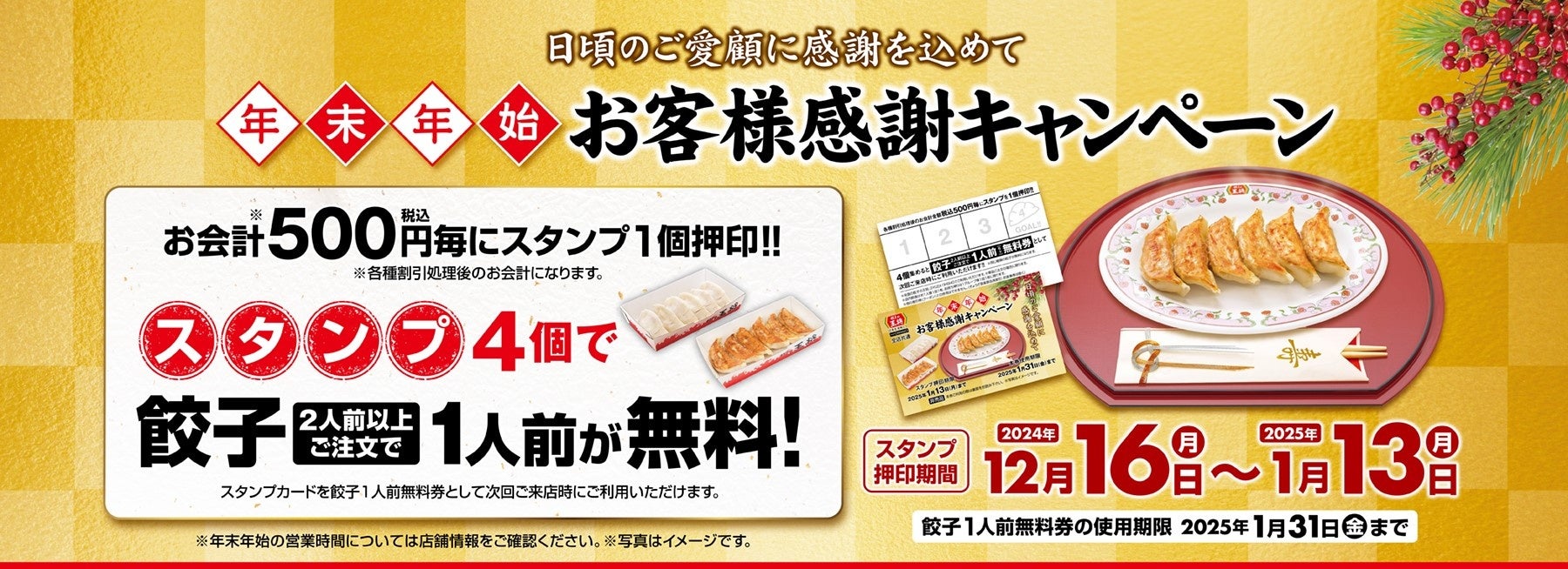 また、2024年12月16日から2025年1月13日の期間、スタンプを集めると”餃子2人前以上ご注文で1人前が無料”になる『年末年始お客様感謝キャンペーン』も実施いたします。