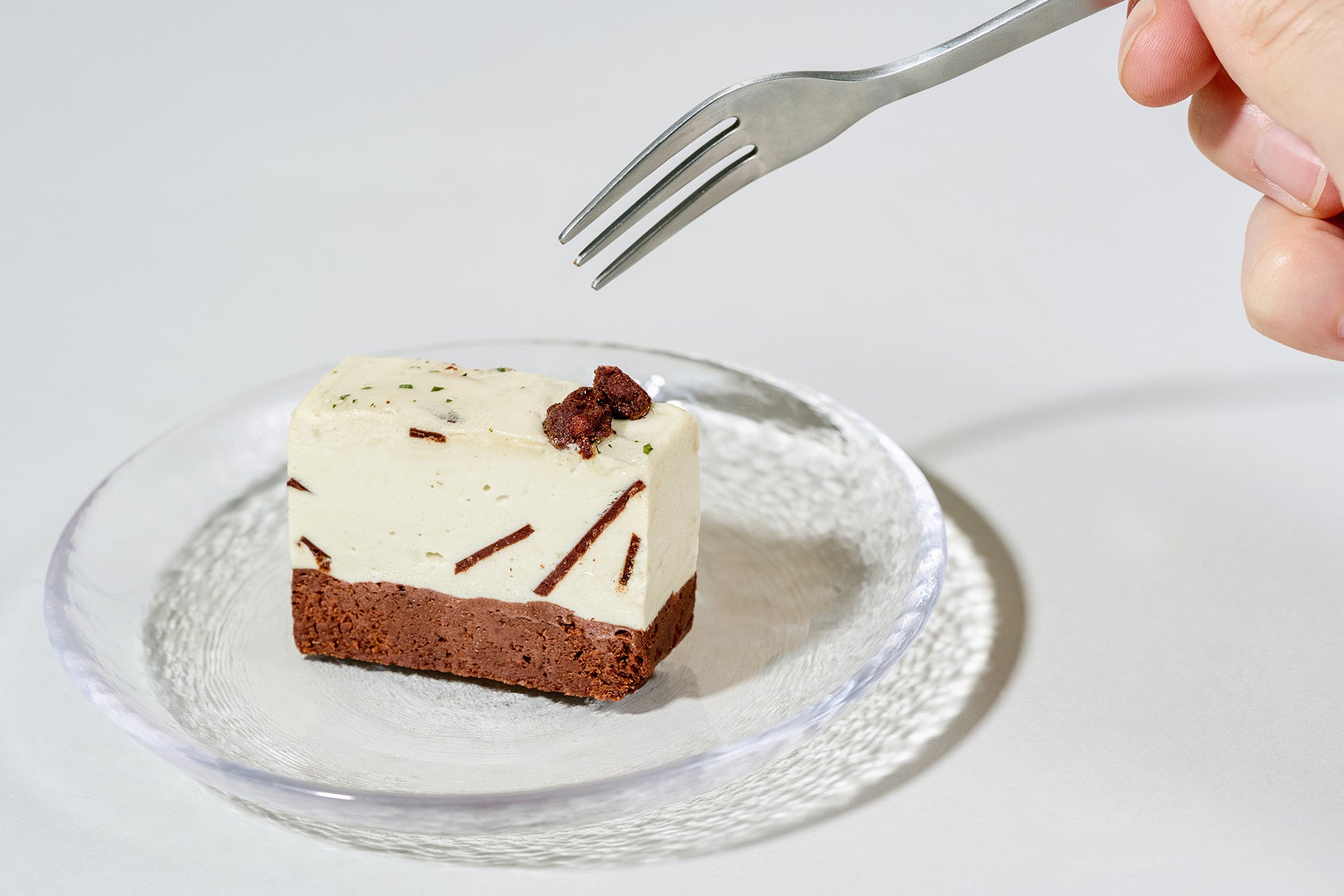 上層は、ホワイトチョコレートに3種の天然ミント、さらにパリパリとした食感が楽しめるチョコレートチップを混ぜたムースを使っています。下層の生ガトーショコラ生地には、ナッツ系の風味が特徴のチョコレートに、ブラジル産カカオ豆を使ったハーバルな印象が特徴のチョコレートをブレンドして使っています。