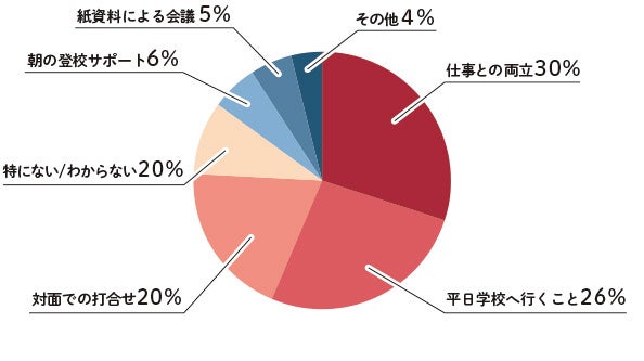 「仕事との両立」「平日学校へ行くこと」「対面での打合せ」が全体の約76%を占めており、(※1)共働き世帯にとって、仕事との両立が難しい活動と考えられます。 ※1 共働き世帯は日本の世帯の約70%を占めている。出典:内閣府「男女共同参画白書 令和4年版」