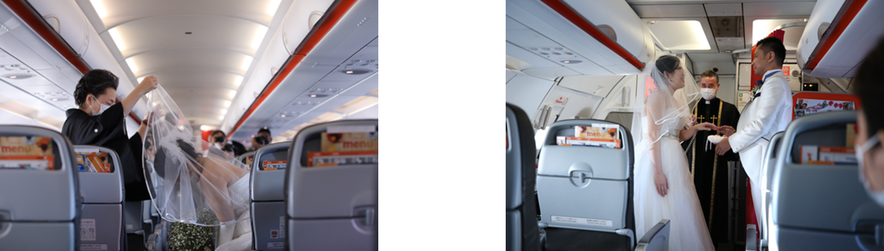 離陸後シートベルトサインが消えると、機内後方にてお母さまにベールダウンをされた新婦は、新郎の待つ機内前方へバージンロードに見立てた通路をゆっくりと向かわれました。そして二人は、ご両親とキャビンクルーに見守られ、牧師の前で指輪を交換、誓いのキスをかわし、永遠の愛を誓いました。そこから、二人の似顔絵が描かれた新婦手作りのウエディングケーキを赤い糸でカットしての微笑ましいファーストバイト、新婦からお母さまへの感謝の言葉が続き、機内は温かくも感動的な空気に包まれました。最後に、「空の上での結婚式という前例のないことができたのも、ひとえに皆様のおかげと心より感謝を申し上げます。昨今のコロナ禍の中、結婚式を開催するイメージが付かなかったところ、このような素晴らしい式を催させて頂き、本当にありがとうございました。お父さんお母さんからもらった愛と同じように、私たちもたくさんの愛を育んでいきたいと思います。」という新郎からの挨拶で結婚式は締めくくられました。