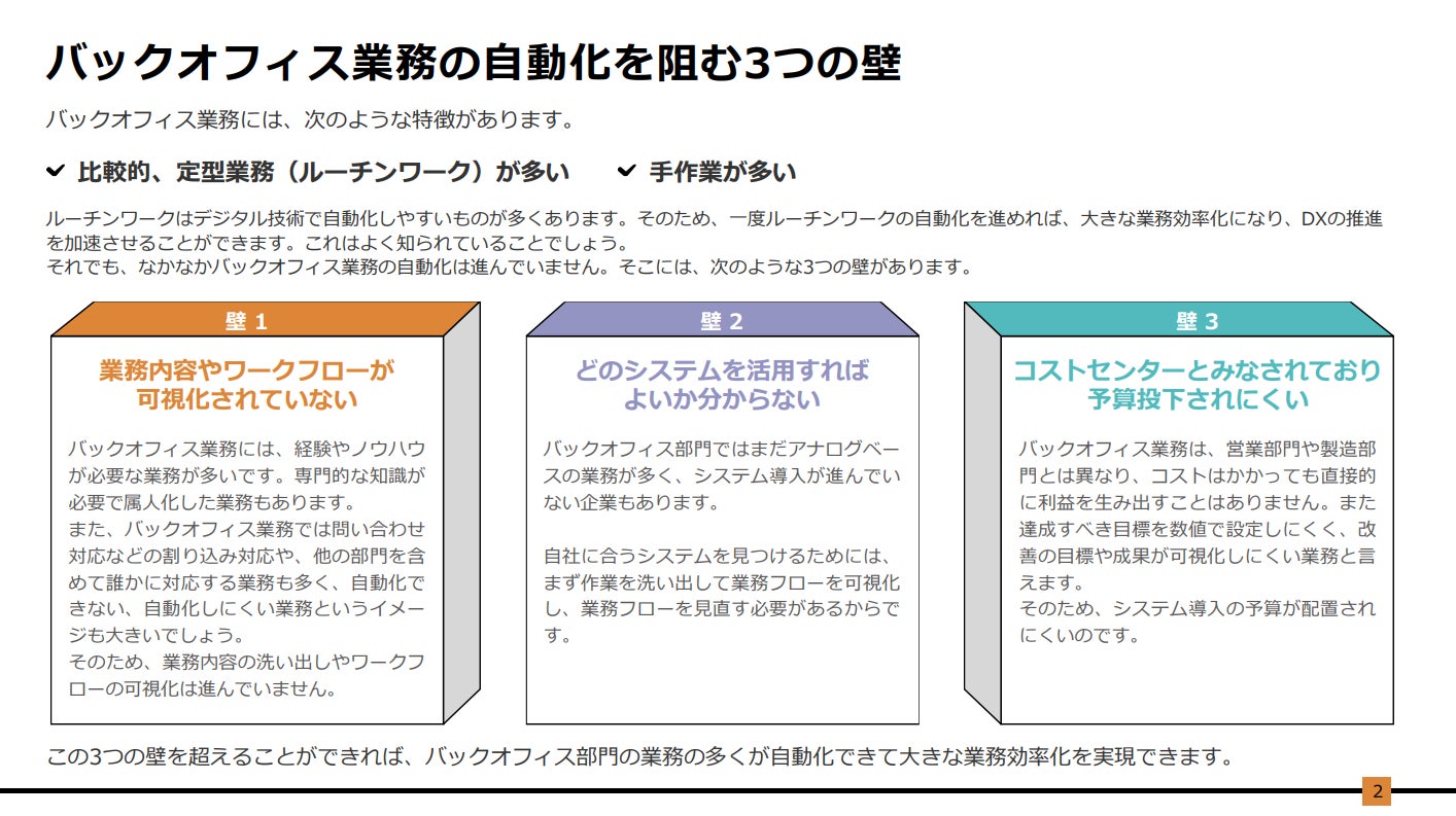 3つの壁を乗り越え成功するバックオフィス業務の自動化法を紹介。
