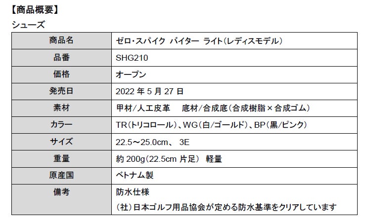 ブリヂストンスポーツ株式会社は、前作モデル(SHG010)をベースに、「さらに快適な履き心地」を追求してリニューアルしたレディスモデルゴルフシューズ『ゼロ・スパイク バイター ライト(SHG210)』と、2.7kgで汎用性の高いシンプルなデザインの軽量レディスモデルキャディバッグ『CBG251』を5月に発売します。