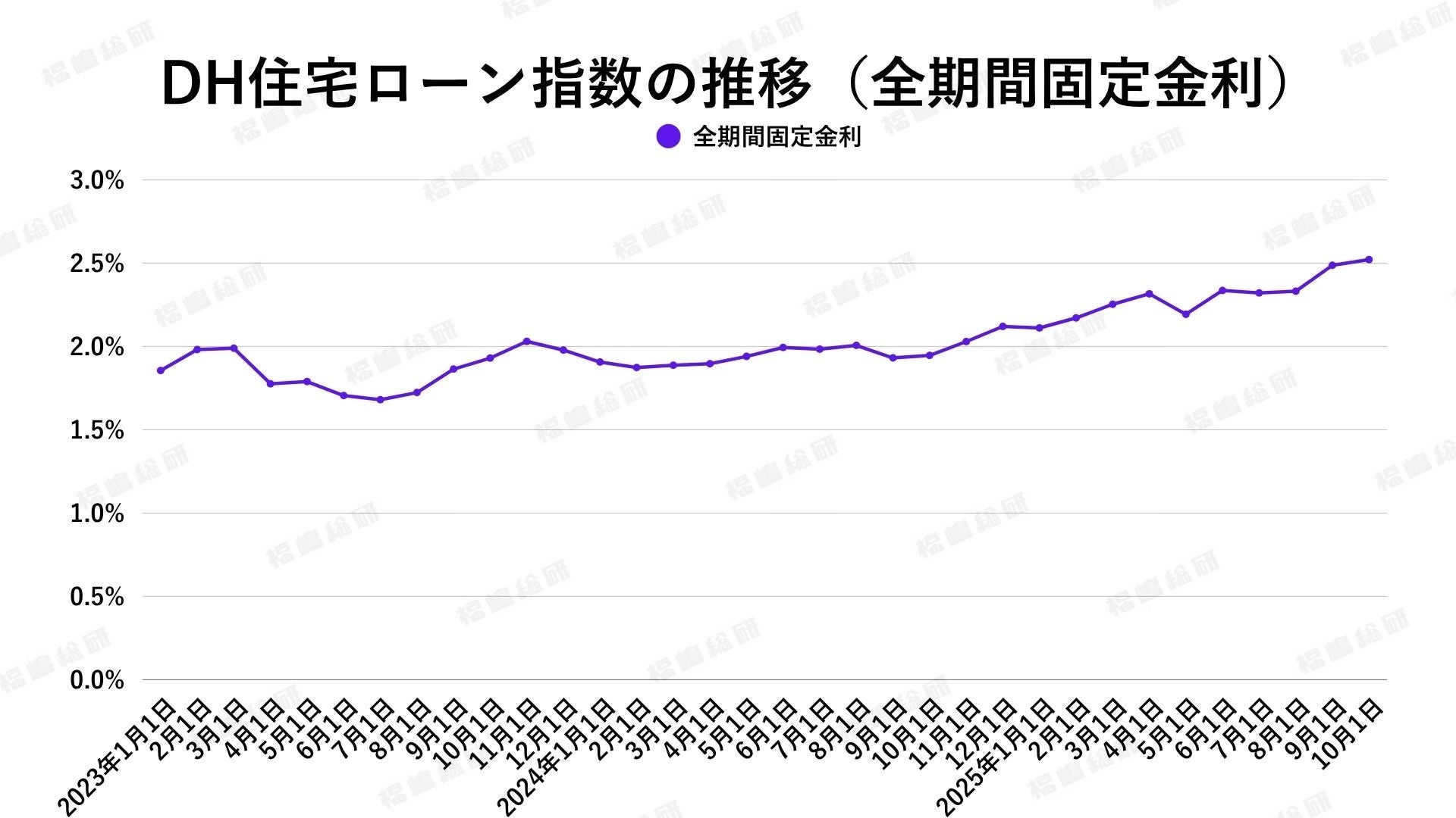 ※DHローン指数:ダイヤモンド不動産研究所とホームローンドクター株式会社が共同で作成している住宅ローン金利の参考指標。主要な銀行の住宅ローン商品をもとに、変動金利・固定金利・全期間固定型などの代表的な金利水準を算出したもので、市場の金利動向を把握するための目安として用いられています。