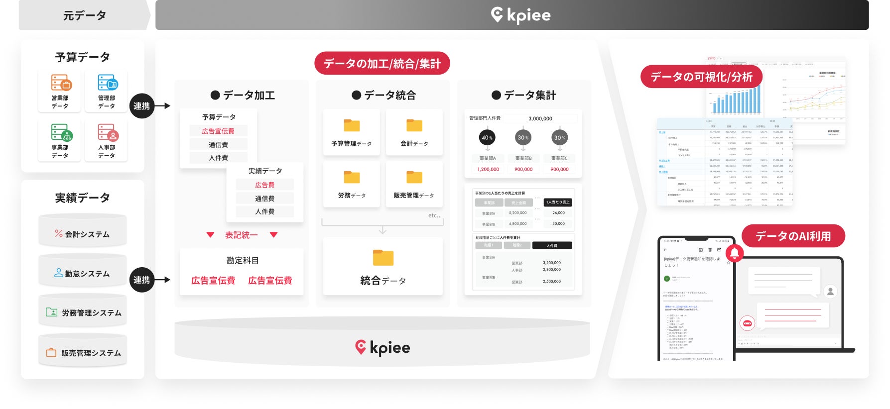 「kpiee」は、経営管理部が抱える、予算策定から経営判断までにおける悩みをまるっと解決し、戦略策定のための時間を創出し、経営の意思決定を実現するクラウドサービスです。複数ツールに散在するデータの集計/分析/可視化を自動化することにより、迅速かつ精度の高い経営判断が可能になります。また生成AIを搭載しており、予実のズレや異常値を自動で通知してくれるほか、気になる数値に対する質問もAIが回答してくれるため、データ活用を促進し経営のクオリティを向上させることができます。