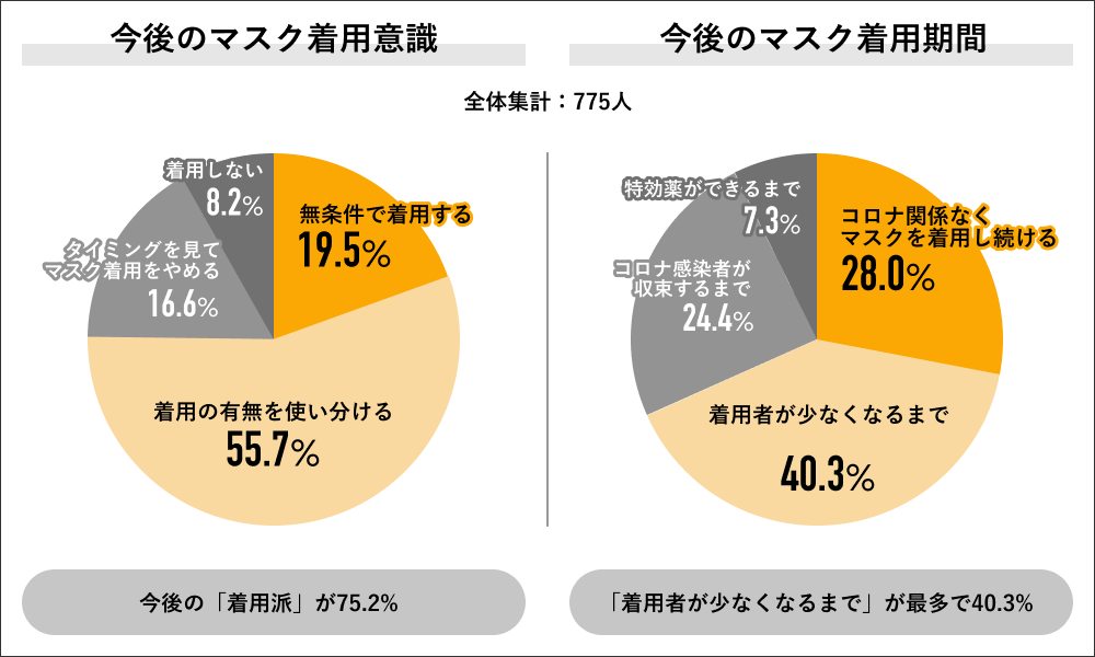 回答者全体の775人に今後のマスク着用意識を聞くと、「着用の有無を使い分ける」が55.7%で最多になり、次いで「無条件で着用する」が19.5%、「タイミングをみて着用をやめる」が16.6%、「着用しない」が8.2%の結果になりました。またいつまでマスクを着用するか(着用をやめるタイミング)について聞くと、「マスクの着用者が少なくなるまで」が40.3%で最多になり、次いで「コロナは関系なくマスクを着用し続ける」が28.0%、「コロナ感染者が収束したら」が24.4%、「特効薬ができるまで」が7.3%の結果になりました。