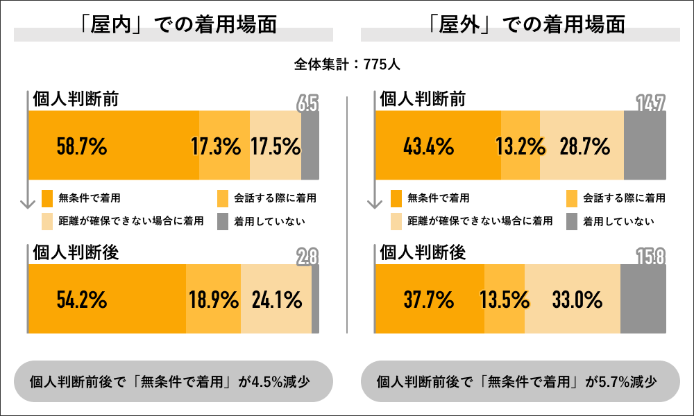 回答者全体の775人にマスク個人判断前の屋内着用状況を聞くと、「無条件で着用」が58.7%で最多になり、次いで「距離が確保できない場合に着用」が17.5%、「会話をする際に着用」が17.3%、「着用していない」が6.5%に対して、個人判断後は「無条件で着用」が54.2%で最多になり、次いで「距離が確保できない場合に着用」が24.1%、「会話をする際に着用」が18.9%、「着用していない」が2.8%でした。
