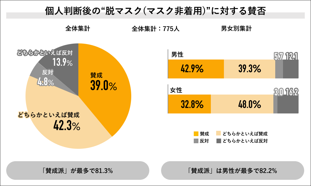 回答者全体の775人に脱マスク(マスク非着用)に対する賛否を聞くと、「賛成」39.0%と「どちらかといえば賛成」42.3%を合算した81.3%が”賛成派”の回答をしました。”反対派”は18.7%で内訳は「反対」が4.8%、「どちらかといえば反対」が13.9%でした。