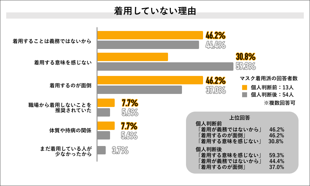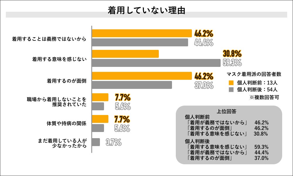 個人判断前に着用していないと回答した13人にその理由を聞くと「着用が義務ではないから」と「着用するのが面倒」が共に46.2%で最多になり、次いで「着用する意味を感じない」が30.8%で上位3つの回答でした。また個人判断後に着用していないと回答した54人にその理由を聞くと、「着用する意味を感じない」が59.3%で最多になり、次いで「着用が義務ではないから」が44.4%、「着用するのが面倒」が37.0で上位3つの回答結果でした。