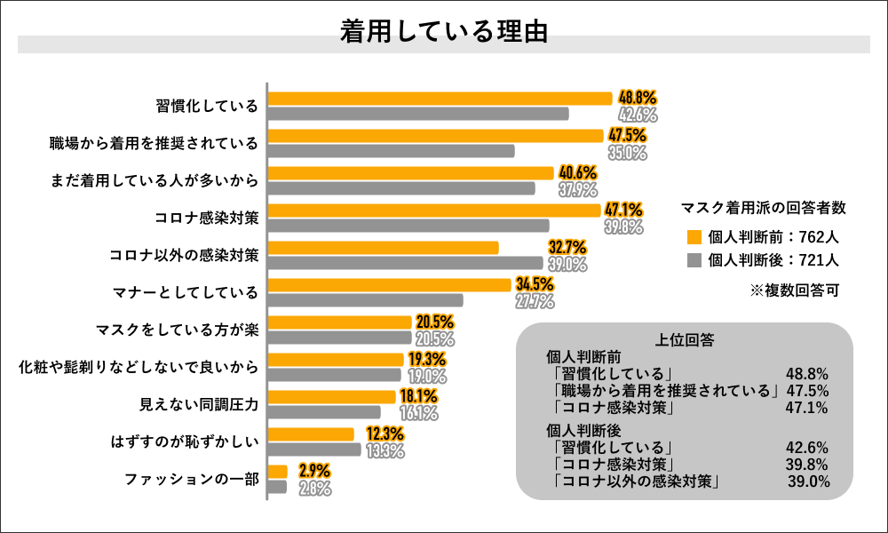 個人判断前に着用していたと回答した762人にその理由を聞くと「習慣化している」が48.8%で最多になり、次いで「職場から着用を推奨されている」が47.5%、「コロナ感染対策」が47.1%、「まだ着用している人が多いから」が40.6%で上位4つの回答でした。