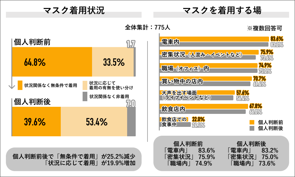 回答者全体の775人にマスク個人判断前の着用状況を聞くと、「状況に関係なく無条件で着用」が64.8%で最多になり、次いで「状況に応じて着用の有無を使い分け」が33.5%、「状況に関係なく非着用」が1.7%に対して、個人判断後は「状況に応じて着用の有無を使い分け」が53.4%で最多になり、次いで「状況に関係なく無条件で着用」が39.6%、「状況に関係なく非着用」が7.0%で、個人判断前後で”無条件で着用”が減少し、”状況に応じて着用”が増加する結果になりました。着用する場所は個人判断前後共に「電車内」が8割超で最多でした。