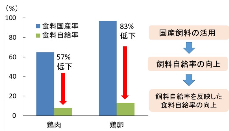 国産鶏の飼料の主な原料はトウモロコシと大豆粕で、いずれも輸入に依存しています。農林水産省の「令和3年度食料自給率・食料自給力指標について」によると、令和3年度の鶏肉および鶏卵の「飼料が国産か輸入かにかかわらず(飼料自給率を反映しない)国内生産した割合[食料国産率]」はそれぞれ65%および96%ですが、「国産飼料のみで(飼料自給率を反映した)国内生産した割合[食料自給率]」は、それぞれ8%および13%に低下します(グラフ参照)。