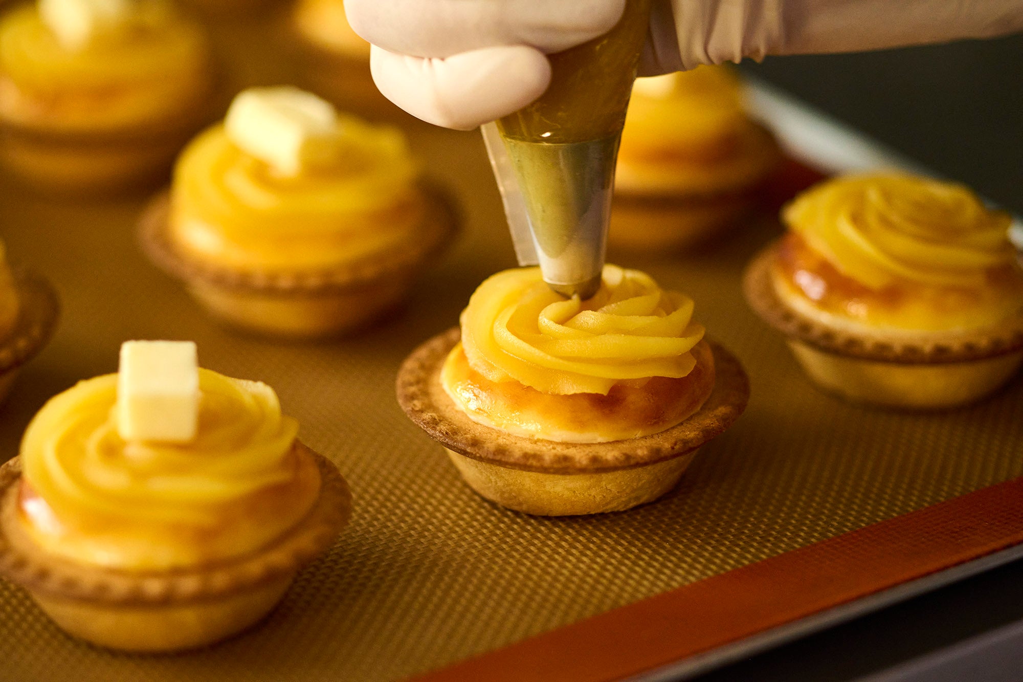今秋のシーズナルチーズタルト第1弾は、秋の味覚であるさつまいも。その中でも、特に甘みが強い品種“紅あずま”を主役にした限定商品です。チーズムースの上に“紅あずま”クリームを絞り、仕上げにバターを乗せて焼きあげています。程よい塩味の効いた濃厚でコク深いバターが、秋の豊かな味覚をより一層引き立てます。ご自宅のオーブンで、少し焦げ目が付くぐらいを目安に1〜2分ほど焼くと、バターの香ばしさが広がり、より一層美味しくお召し上がりいただけます。