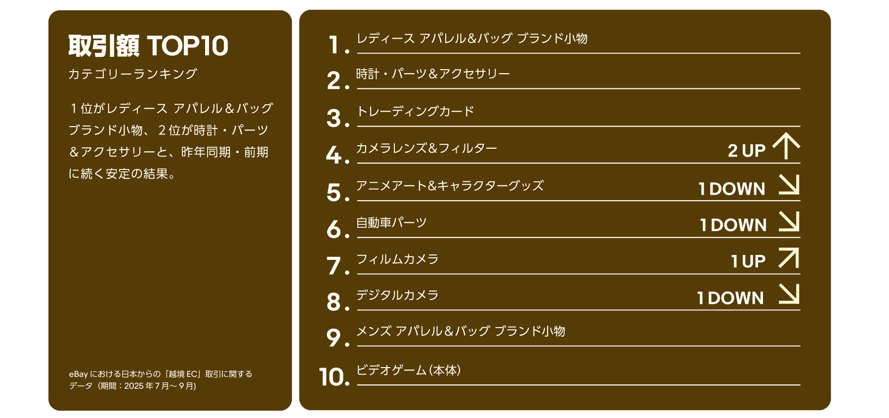 世界最大規模のオンライン・マーケットプレイス「eBay(イーベイ)」への出店を通じ、16年以上日本セラーの越境EC(海外販売)を支援するイーベイ・ジャパン株式会社(所在地︓東京都渋谷区、代表取締役社長︓岡田 雅之、以下イーベイ・ジャパン)は、2025年(7-9月)の期間において日本セラー(販売者)から出品されたアイテムの販売動向を発表しました。