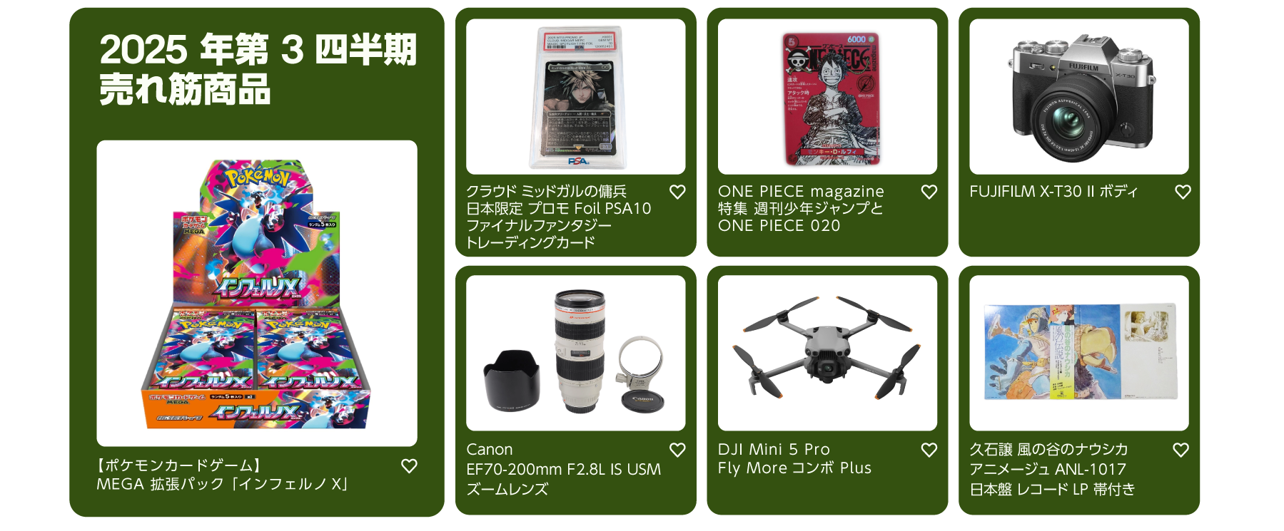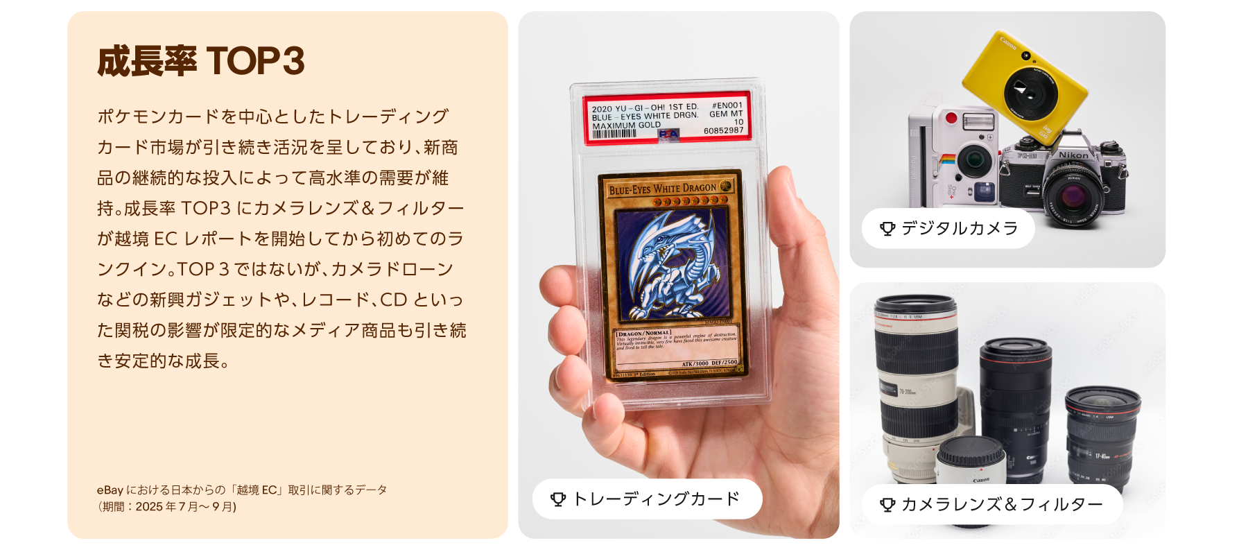 ・米国関税免除「デミニミス・ルール」撤廃で大きな転換期。関税込み配送(DDP)の必須化への準備を進める。 ・非米国への販売意欲がさらに高まる。販路の多極化と収益安定化に向けた動きが本格化。 ・トレーディングカードをはじめとした日本のカルチャーや、Pre-loved(プリラブド)商材に触れる若年層が増加。 ・SNSでの映像制作ブームを背景に、カメラドローンが新しく躍進。 |