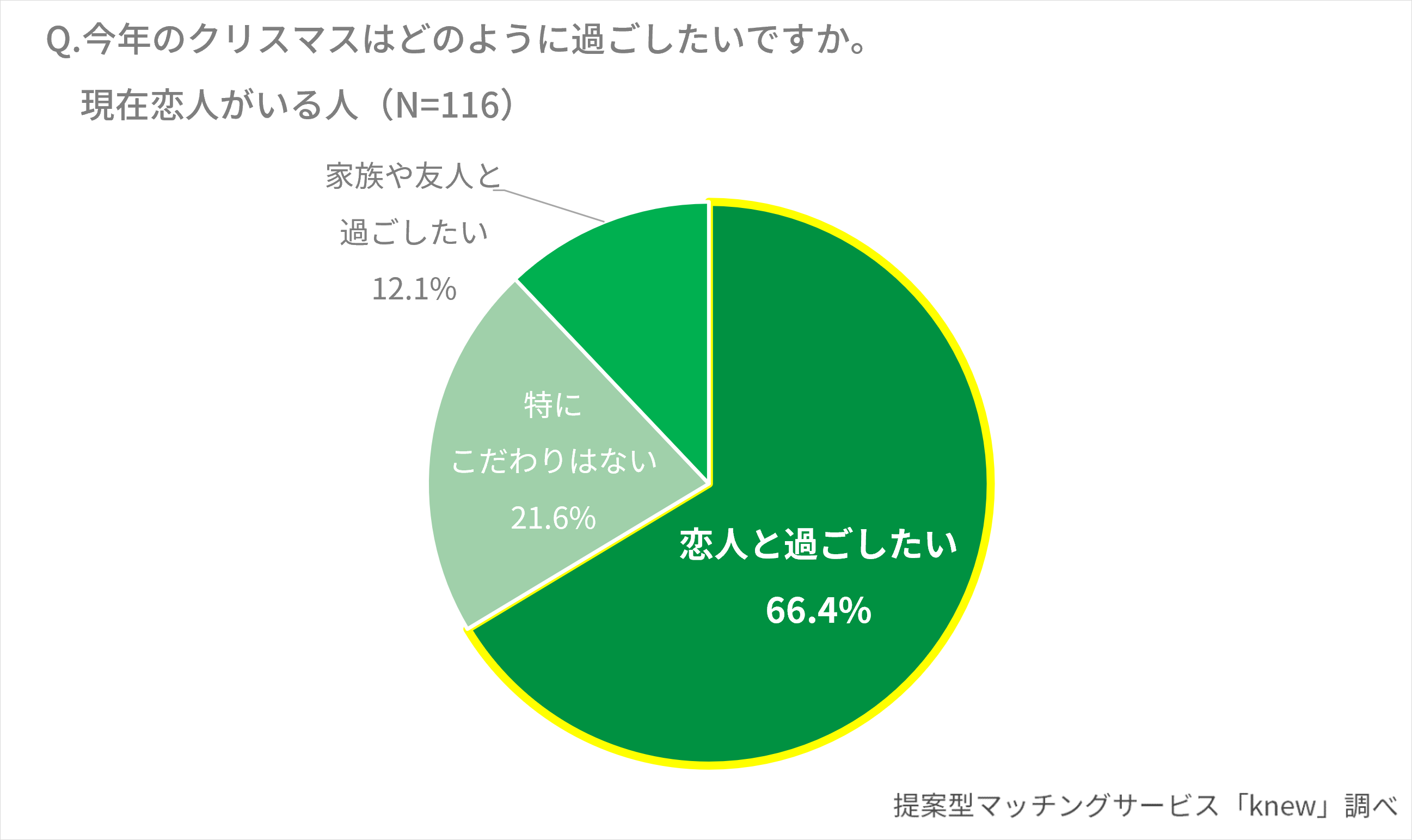 そして、恋人の有無と今年のクリスマスの過ごし方の結果をかけ合わせると、「現在恋人がいる」人の66.4%は「恋人と過ごしたい」と回答しており、「現在恋人がいない」人の69.1%が「特にこだわりはない」と回答していることが分かりました。